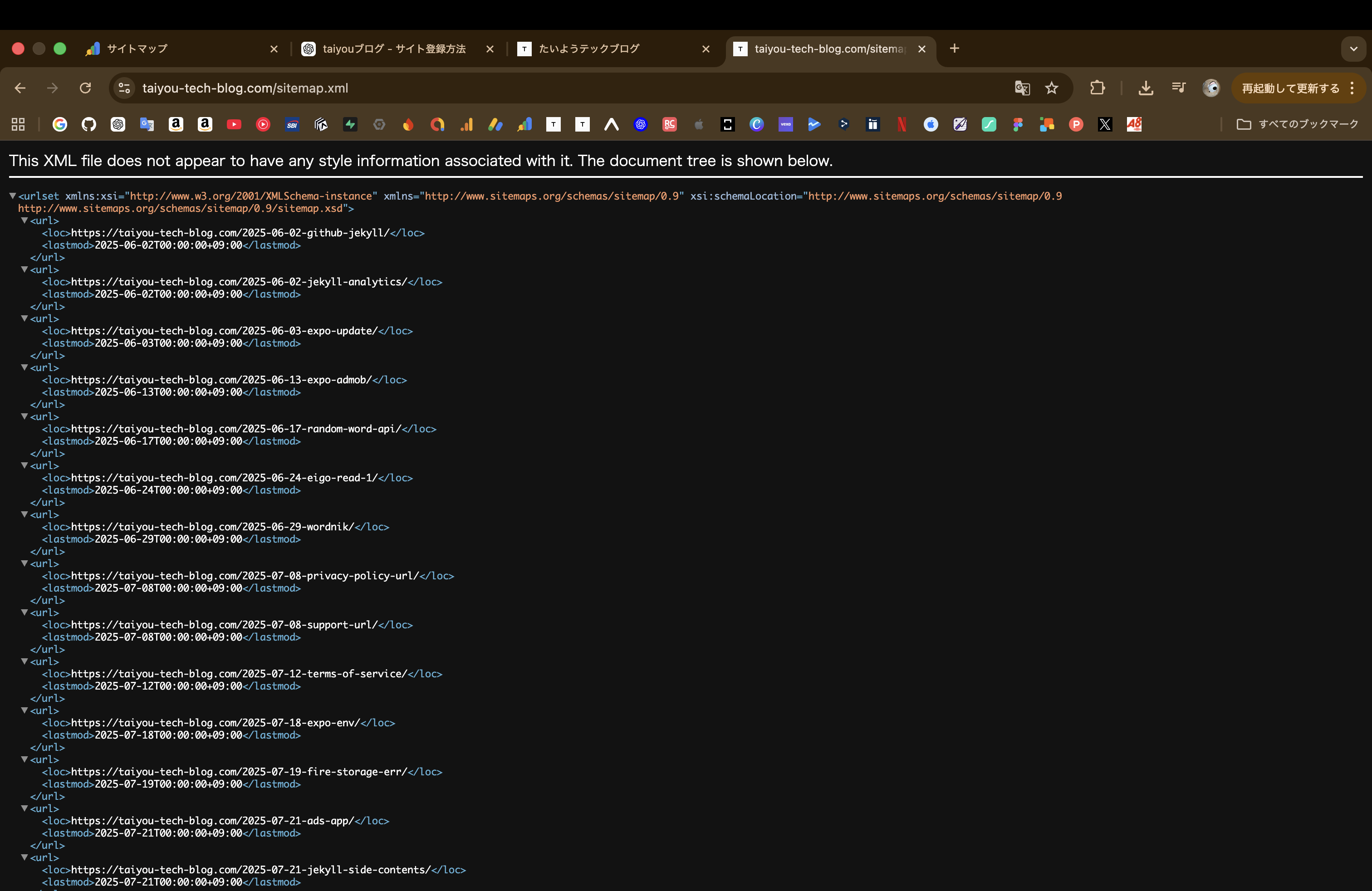 実際に sitemap.xml を開いたら、こんな感じでした。
